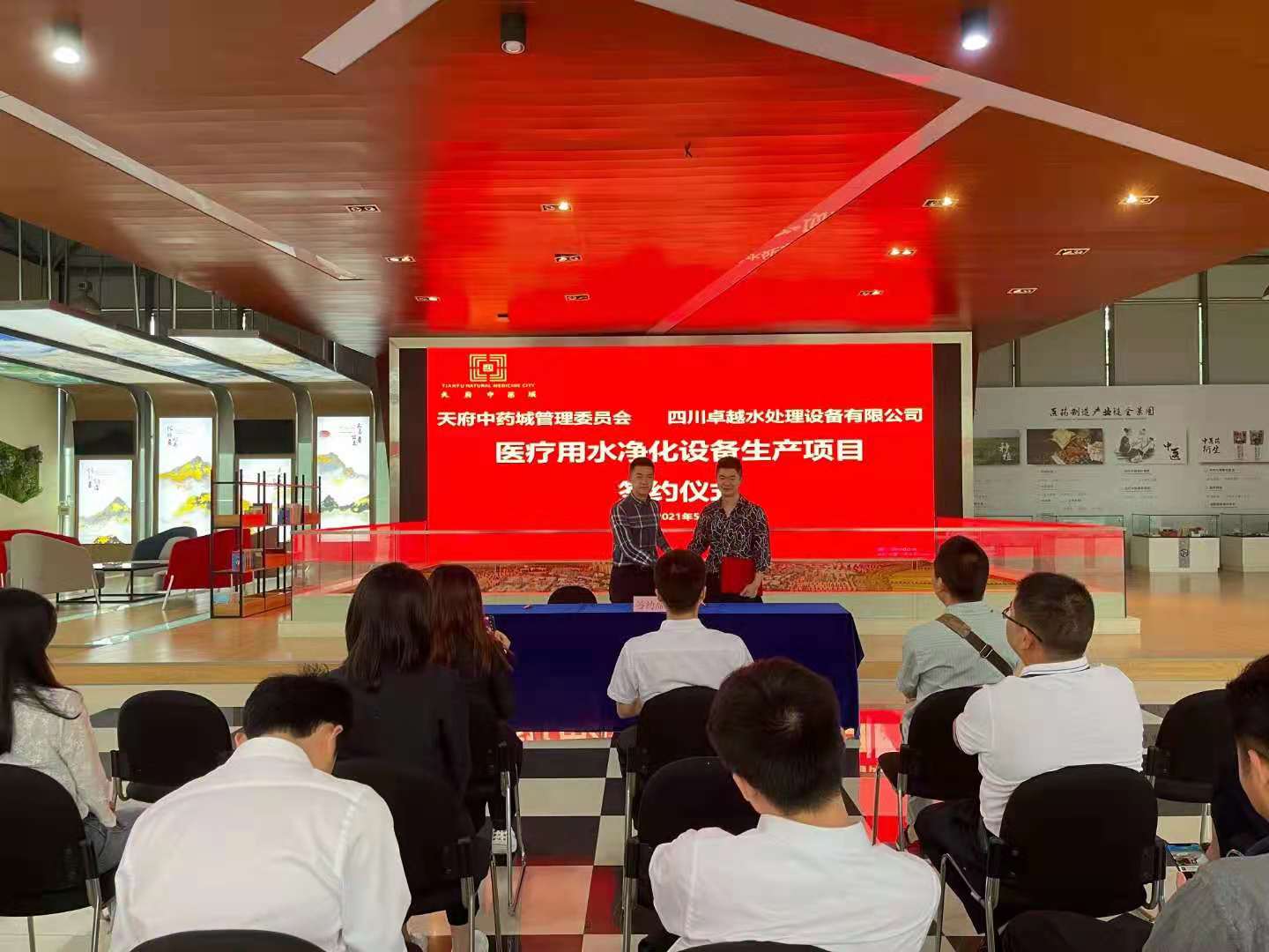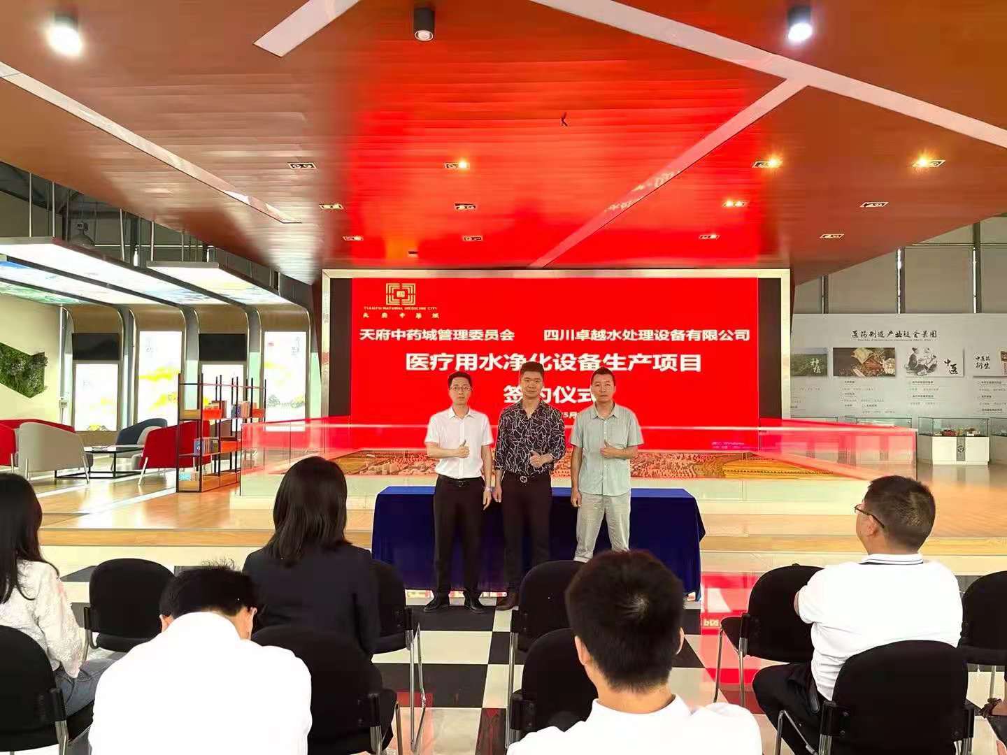 簽約儀式上,四川省彭州工業(yè)開發(fā)區(qū)管理委員會(huì)、彭州市中醫(yī)藥管理局和天府中藥城管理委員代表會(huì)分別致歡迎辭,表示歡迎四川卓越水處理設(shè)備有限公司入駐天府中醫(yī)院城,祝愿我們能在新的征程路上攜手并進(jìn),開創(chuàng)新的輝煌。隨后四川卓越水處理總經(jīng)理?xiàng)罱ㄉ吓_(tái)發(fā)言,他首先感謝彭州市天府中藥城給予的優(yōu)惠政策和新建廠房的幫助,并表示在接下來的日子里,四川卓越將一如既往秉持“ 以信立業(yè)、創(chuàng)新共贏”的經(jīng)營理念,以“專業(yè)專注,用心服務(wù)”作為一貫宗旨,與天府中藥城攜手,加強(qiáng)在醫(yī)療用水凈化設(shè)備等行業(yè)的合作,為醫(yī)療事業(yè)做出自己的貢獻(xiàn)。