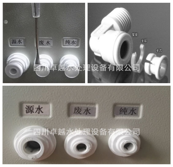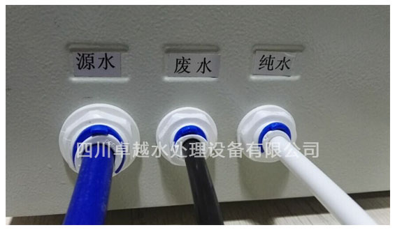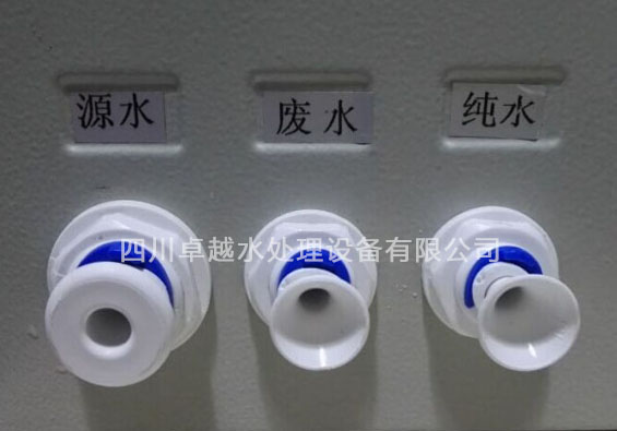 超純水機(jī)在出廠前都會用堵頭,堵著源水,廢水,純水三個接口。如圖所示: