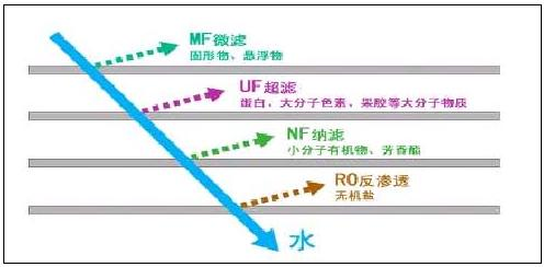 分離膜是具有選擇性分離功能的材料,利用膜的選擇性分離實(shí)現(xiàn)料液的不同組分的分離、純化、濃縮的過(guò)程稱(chēng)作膜分離。它與傳統(tǒng)過(guò)濾的不同在于,膜可以在分子范圍內(nèi)進(jìn)行分離,并且這過(guò)程是一種物理過(guò)程,不需發(fā)生相的變化和添加助劑。膜的孔徑一般為微米級(jí),依據(jù)其孔徑的不同(或稱(chēng)為截留分子量),可將膜分為微濾膜、超濾膜、納濾膜和反滲透膜,根據(jù)材料的不同,可分為無(wú)機(jī)膜和有機(jī)膜,無(wú)機(jī)膜主要是陶瓷膜和金屬膜,其過(guò)濾精度較低,選擇性較小。有機(jī)膜是由高分子材料做成的,如醋酸纖維素、芳香族聚酰胺、聚醚砜、聚氟聚合物等等。錯(cuò)流膜工藝中各種膜的分離與截留性能以膜的孔徑和截留分子量來(lái)加以區(qū)別,下圖簡(jiǎn)單示意了四種不同的膜分離過(guò)程:(箭頭反射表示該物質(zhì)無(wú)法透過(guò)膜而被截留):