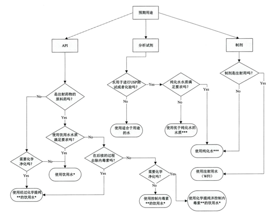 在《美國(guó)藥典》制藥用途水中有專門的論述,并有一個(gè)圖可供參考USP32 1231 Fig. 2 Selection of water for pharmaceutical purposes.